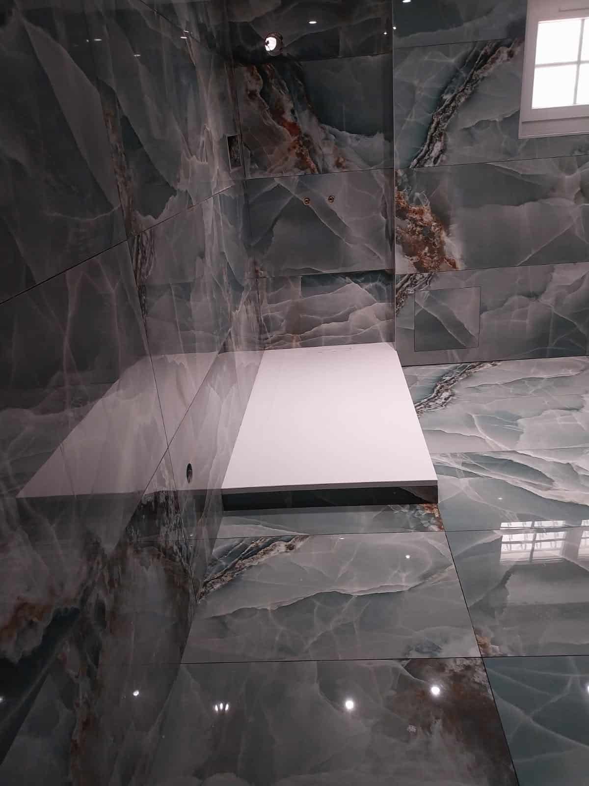 La salle de bains parentale a été transformée avec douche italienne carrelage grand format, meuble vasque double en solid surface, miroir lumineux LED et ventilation VMC hygroréglable. La salle d’eau de l’étage bénéficie d’une baignoire îlot, robinetterie noire mate et faïence aspect marbre.